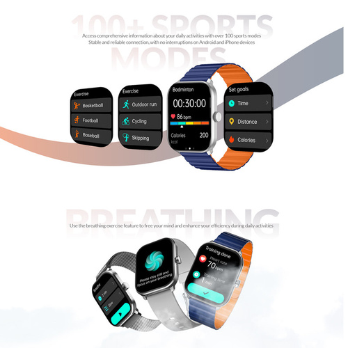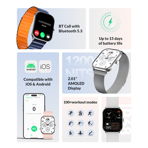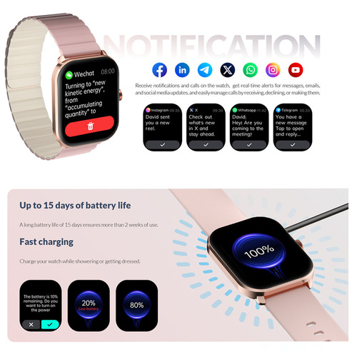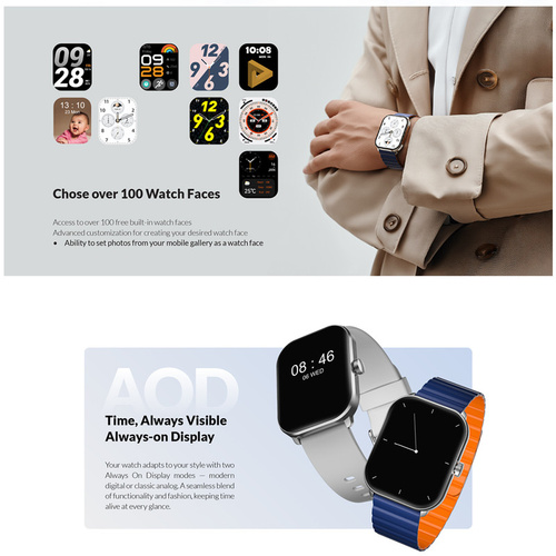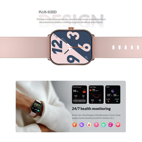 ساعت هوشمند گلوریمی مدل GC Plus یک انتخاب مناسب برای کاربری عمومی، ورزشی و روزمره است که با سایز قاب 46 میلیمتری و فرم مستطیلی طراحی شده و ابعاد قاب آن 45.8x37x11.6 میلیمتر است و با هر دو سیستمعامل Android و iOS سازگار است و امکان نمایش اعلانها و پیامها را به زبانهای فارسی و انگلیسی دارد و همچنین از زبان فارسی در منو و سیستمعامل پشتیبانی میکند؛ این ساعت با بدنهای از جنس پلیکربنات مقاوم و شیشه 2.5D و دکمه چرخان (Rotating Crown Button) و دکمههای استیل ضدزنگ 304L ساخته شده که مقاومت خوبی در برابر نفوذ آب و گردوغبار دارد و همراه با دو بند متنوع ارائه میشود: یک بند مغناطیسی (یا استیل مغناطیسی) و یک بند سیلیکونی مایع برای راحتی بیشتر؛ صفحه نمایش 2.01 اینچی AMOLED آن با رزولوشن 410x502 و روشنایی 1200 نیت، وضوح و کیفیت تصویر بالایی دارد و قابلیت نمایشگر همیشه روشن (Always-on Display) را نیز پشتیبانی میکند؛ از قابلیتهای هوشمند GC Plus میتوان به مکالمه از طریق بلوتوث، کنترل موسیقی و قابلیت تغییر تم اشاره کرد؛ در بخش سلامتی و ورزشی، این ساعت مجهز به حسگرهایی چون شمارنده ضربان قلب، سنجش اکسیژن خون (SpO2)، سنجش کیفیت خواب و نظارت بر سیکل ماهیانه بانوان است و از تمرینات مختلف ورزشی و محاسبه مسافت طی شده پشتیبانی میکند و حسگرهای حرکتی شتابسنج و گامشمار نیز فعالیت روزانه را ثبت میکنند؛ باتری 300 میلیآمپر ساعتی این ساعت از نوع لیتیوم پلیمری است که از طریق کابل شارژ مغناطیسی در مدت زمان حدود 2 ساعت شارژ میشود و با بهرهگیری از بلوتوث نسخه 5.3 اتصال پایدار و سریع را تضمین میکند و اقلام همراه شامل دو بند، محافظ صفحه نمایش، کابل شارژ مغناطیسی و دفترچه راهنما است.